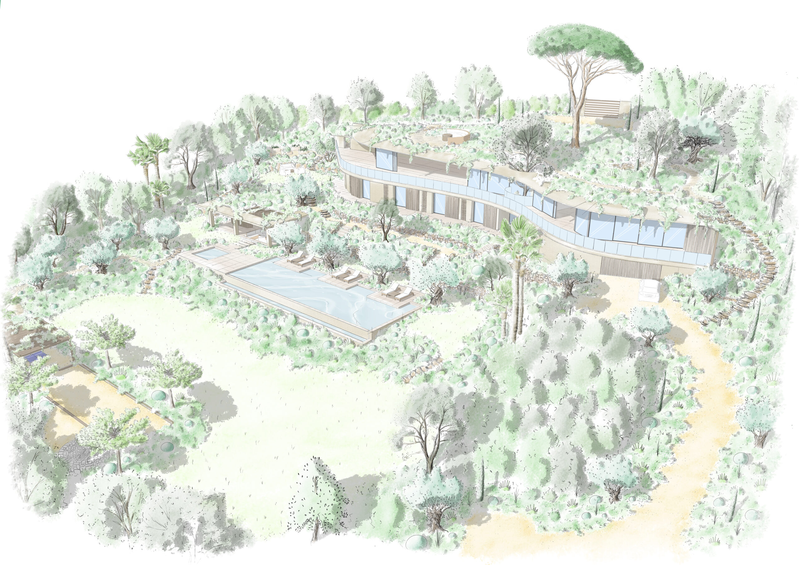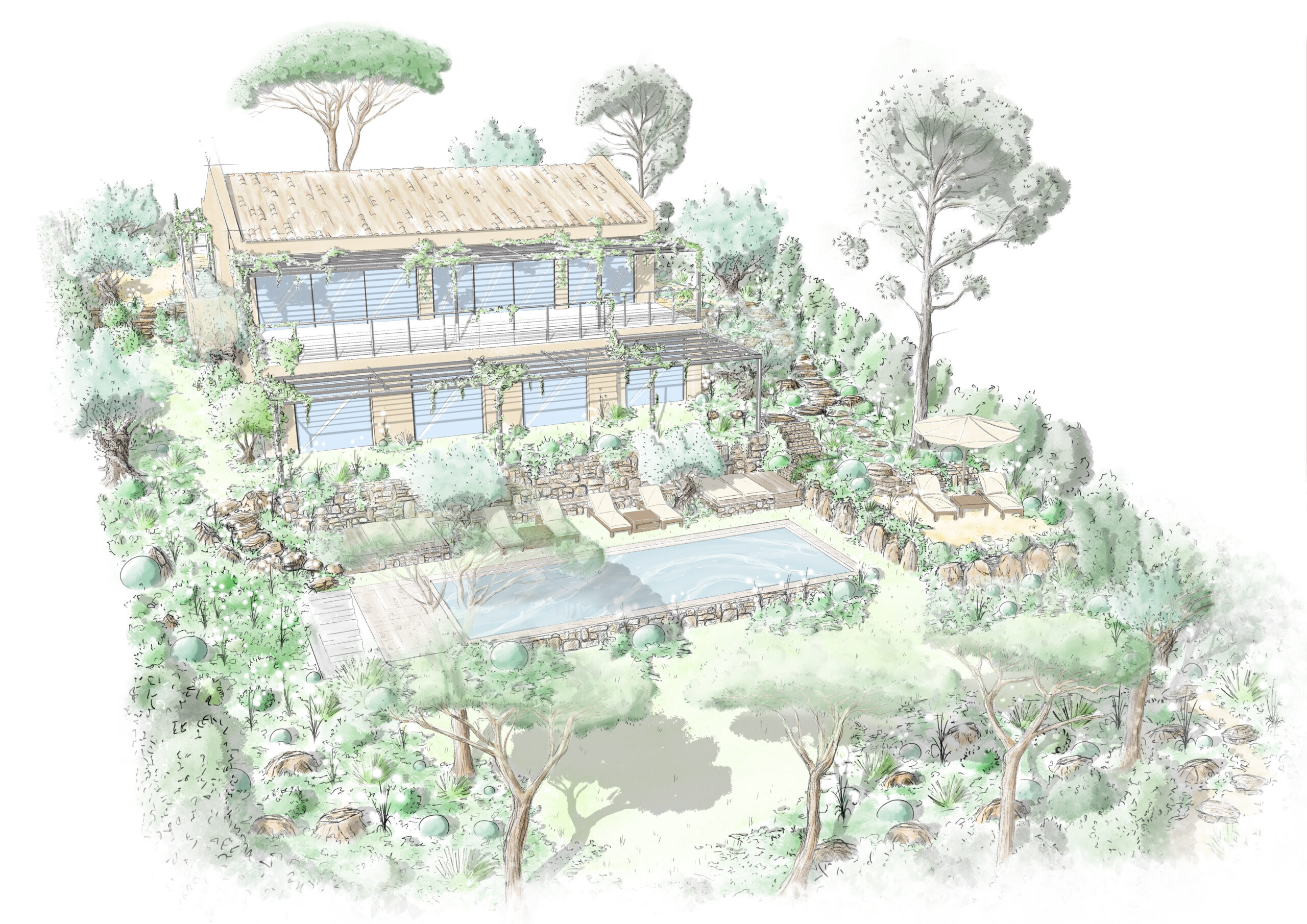 Porté par la sensibilité artistique de Michaël REBOTIER, architecte paysagiste, son bureau d’études cultive une approche artisanale du paysage, où chaque projet prend forme à travers le dessin à la main.